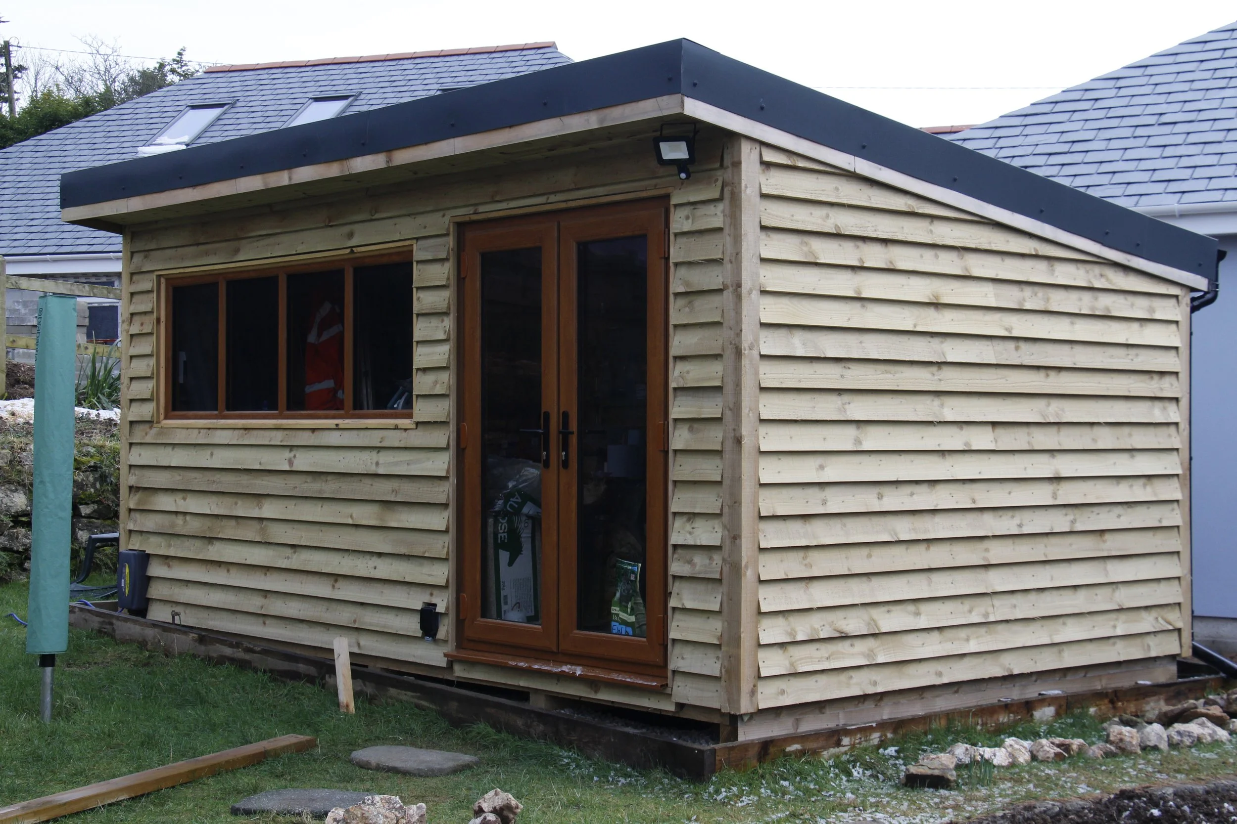 We wanted a good quality, low maintenance workshop for woodworking and somewhere to store the growing collection of tools. Not finding exactly what we wanted from the offerings available at the time we took on the build ourselves. This allowed us to specify high quality materials such as the metal roof and thick profile cladding and create a robust long lasting build that has more in common with a timber frame house than a typical garden shed!